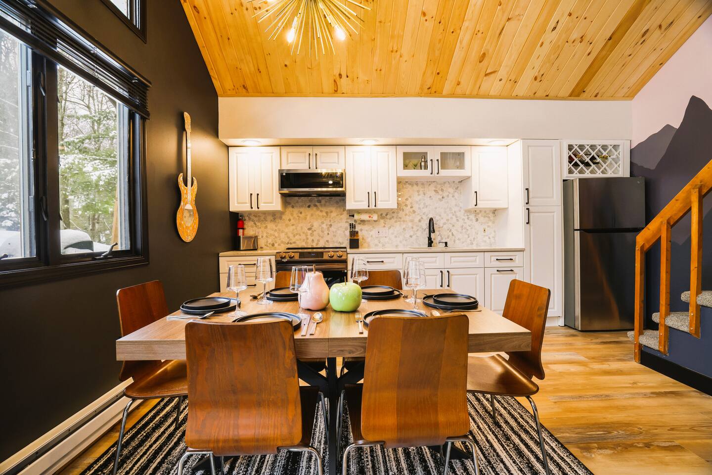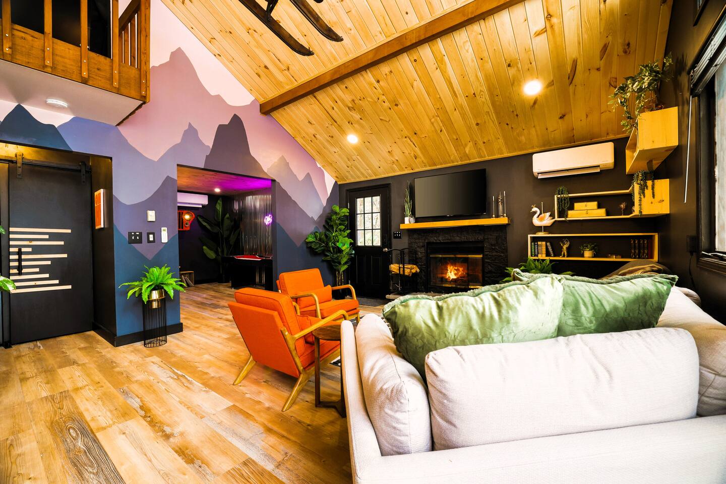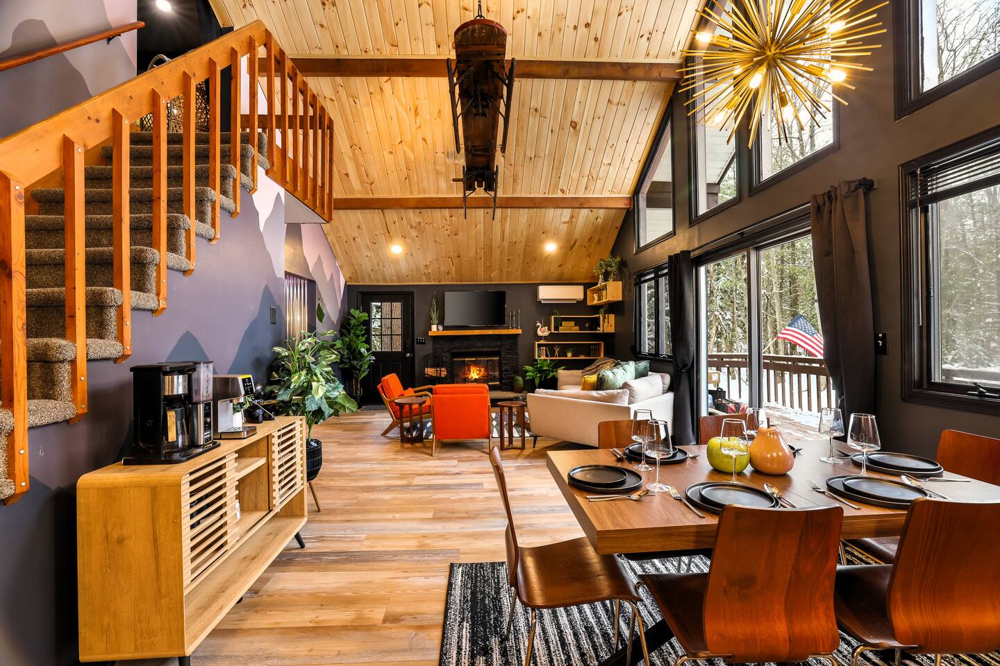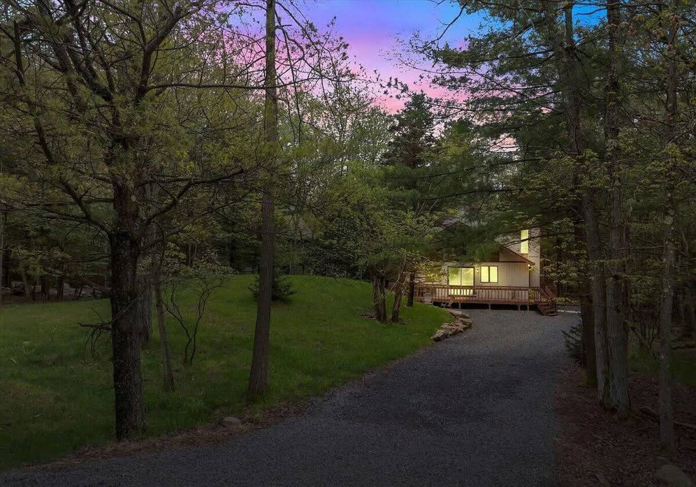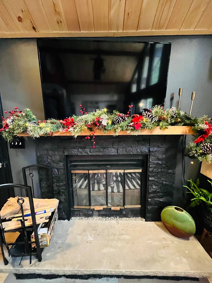 Fun Funky Chalet in Lake Harmony! This cozy & tranquil retreat features two bedrooms, two full baths, infrared sauna, Hot Tub for 6 and a fun Game Room including shuffleboard, 2 person arcade table, record player and an oversized Connect4. No matter what the weather brings, you'll always have something fun to do! The lofted pine ceiling creates such a warm atmosphere, along with the unique Sled hanging from it! The whole wall mountain mural will remind you that you are on Vacation, so relax and enjoy! The house flow is very open, with a connected kitchen, dining area and living room. The kitchen provides you everything needed to prepare your meals, and has a separate coffee station offering a 12cup drip coffeemaker as well as an Expresso machine. Living space has plenty of seating for all of your guests, with a large Smart TV and real wood burning fireplace, with the game room right off of the living room, The first floor also has the guest bedroom and bathroom. Here is the layout : Main Floor Guest Room includes a Queen and a Full Bed, large closet bureau room darkening shades, Heat & AC split and Smart TV. Main Floor Full Bath has a Shower-Tub combowith 2 head shower, and hair dryer. Second Floor Master Bedroom includes a King Bed, bureau, Sauna, sliders to upper deck, room darkening shades, Smart TV, Heat & AC split unit, and walk in closet. Second Floor En-suite Bathroom has a double sliding door entry, exposing the gorgeous, huge walk-in shower for 2,. The front of the house has a huge wrap around deck with seating, gas firetable and gas grill. The hot tub is located right off of the deck, and the wood firepit is alongside the home. We are Pet friendly! $40 per pet per stay :-) Parking 3-4 cars in the driveway. SUMMERTIME: We will include passes to the private Estates Beach Club! With large sandy beach area, grassy shaded area and swim out platform which is everyone's favorite! Bring your Pickleball racquets and play a round or two on the court. WINTERTIME: We are located 2 miles from Big Boulder Resort which offers Ski/Snowboarding and Tubing into the evenings. Jack Frost Resort is 5 miles and offers Ski & Snowboarding until 4pm I have a local guide that provides all details to local dining, shopping and area fun ideas such as golfing, hiking, water parks and more! We look forward to hosting you! Amy Servis