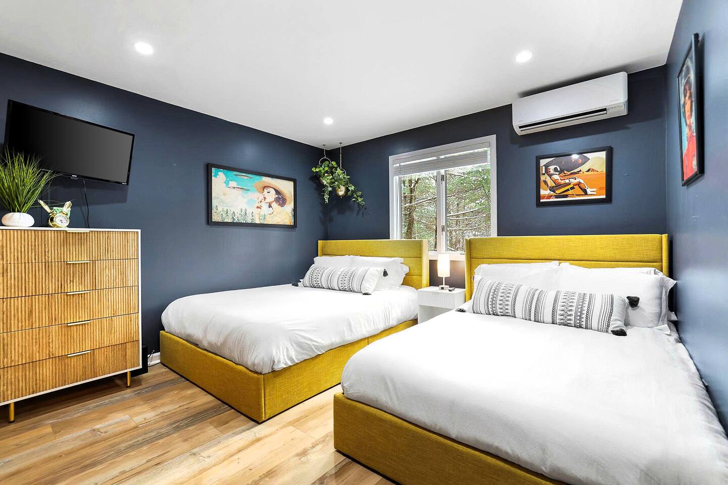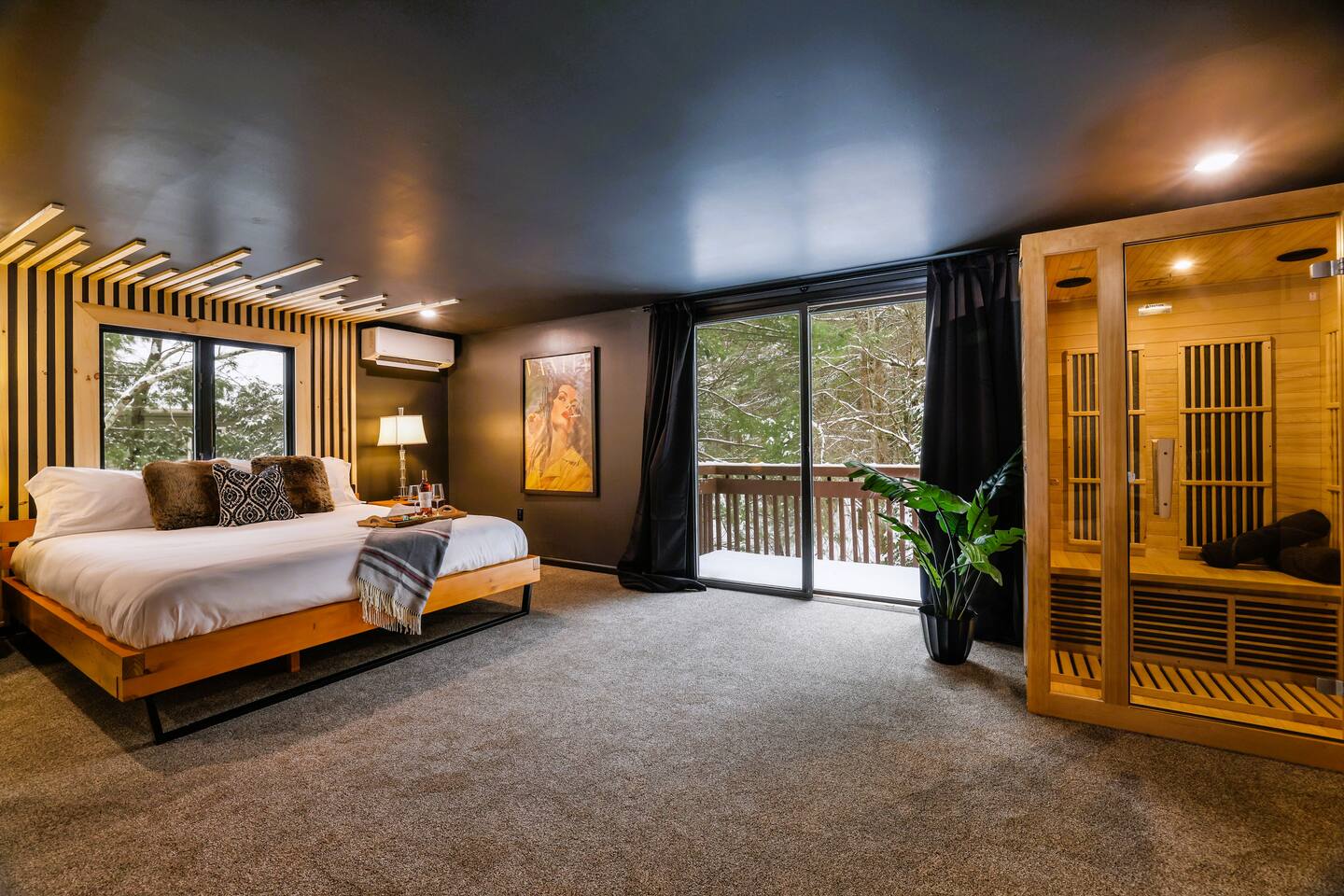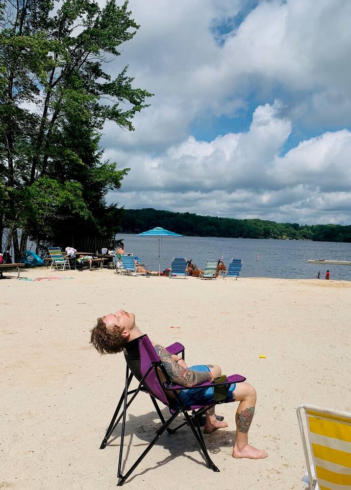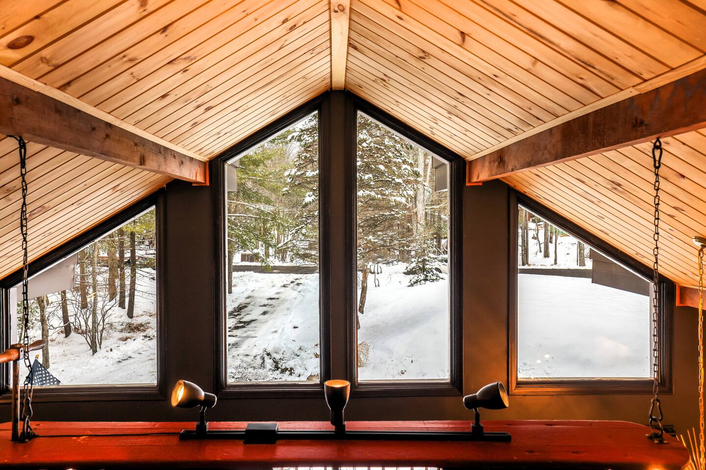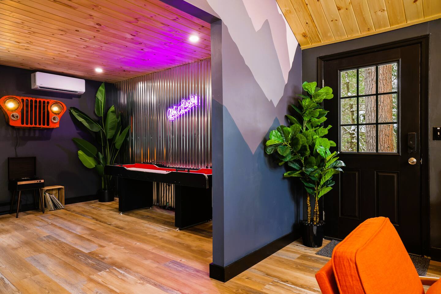 Fun Funky Chalet in Lake Harmony! This cozy & tranquil retreat features two bedrooms, two full baths, infrared sauna, Hot Tub for 6 and a fun Game Room including shuffleboard, 2 person arcade table, record player and an oversized Connect4. No matter what the weather brings, you'll always have something fun to do! The lofted pine ceiling creates such a warm atmosphere, along with the unique Sled hanging from it! The whole wall mountain mural will remind you that you are on Vacation, so relax and enjoy! The house flow is very open, with a connected kitchen, dining area and living room. The kitchen provides you everything needed to prepare your meals, and has a separate coffee station offering a 12cup drip coffeemaker as well as an Expresso machine. Living space has plenty of seating for all of your guests, with a large Smart TV and real wood burning fireplace, with the game room right off of the living room, The first floor also has the guest bedroom and bathroom. Here is the layout : Main Floor Guest Room includes a Queen and a Full Bed, large closet bureau room darkening shades, Heat & AC split and Smart TV. Main Floor Full Bath has a Shower-Tub combowith 2 head shower, and hair dryer. Second Floor Master Bedroom includes a King Bed, bureau, Sauna, sliders to upper deck, room darkening shades, Smart TV, Heat & AC split unit, and walk in closet. Second Floor En-suite Bathroom has a double sliding door entry, exposing the gorgeous, huge walk-in shower for 2,. The front of the house has a huge wrap around deck with seating, gas firetable and gas grill. The hot tub is located right off of the deck, and the wood firepit is alongside the home. We are Pet friendly! $40 per pet per stay :-) Parking 3-4 cars in the driveway. SUMMERTIME: We will include passes to the private Estates Beach Club! With large sandy beach area, grassy shaded area and swim out platform which is everyone's favorite! Bring your Pickleball racquets and play a round or two on the court. WINTERTIME: We are located 2 miles from Big Boulder Resort which offers Ski/Snowboarding and Tubing into the evenings. Jack Frost Resort is 5 miles and offers Ski & Snowboarding until 4pm I have a local guide that provides all details to local dining, shopping and area fun ideas such as golfing, hiking, water parks and more! We look forward to hosting you! Amy Servis